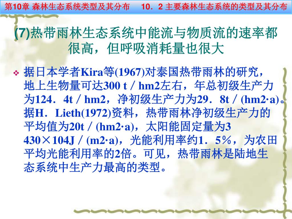 第10章 森林生态系统类型及其分布 10.2 主要森林生态系统的类型及其分布 (7)热带雨林生态系统中能流与物质流的速率都很高,但呼吸消耗量也很大 • 据日本学者Kira等(1967)对泰国热带雨林的研究,地上生物量可达300 t/hm2左右,年总初级生产力为124.4t/hm2,净初级生产力为29.8t/(hm2·a)。据H.Lieth(1972)资料,热带雨林净初级生产力的平均值为20t/(hm2·a),太阳能固定量为3 430×104J/(m2·a),光能利用率约1.5%,为农田平均光能利用率的2倍。可见,热带雨林是陆地生态系统中生产力最高的类型。