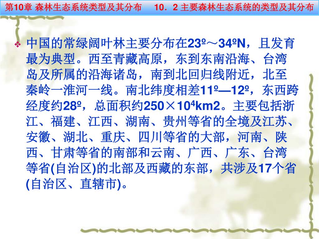 第10章 森林生态系统类型及其分布 10.2 主要森林生态系统的类型及其分布 • 中国的常绿阔叶林主要分布在23º~34ºN,且发育最为典型。西至青藏高原,东到东南沿海、台湾岛及所属的沿海诸岛,南到北回归线附近,北至秦岭一淮河一线。南北纬度相差11º—12º,东西跨经度约28º,总面积约250×104km2。主要包括浙江、福建、江西、湖南、贵州等省的全境及江苏、安徽、湖北、重庆、四川等省的大部,河南、陕西、甘肃等省的南部和云南、广西、广东、台湾等省(自治区)的北部及西藏的东部,共涉及17个省(自治区、直辖市)。