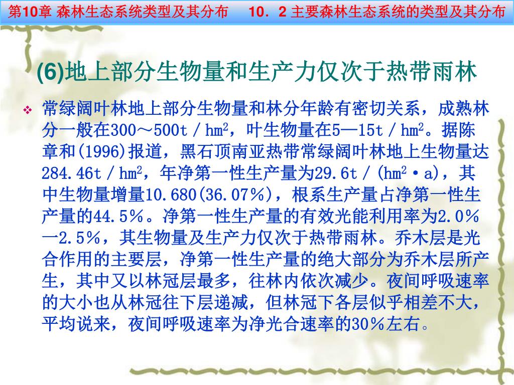 第10章 森林生态系统类型及其分布 10.2 主要森林生态系统的类型及其分布 (6)地上部分生物量和生产力仅次于热带雨林 • 常绿阔叶林地上部分生物量和林分年龄有密切关系,成熟林分一般在300~500t/hm2,叶生物量在5—15t/hm2。据陈章和(1996)报道,黑石顶南亚热带常绿阔叶林地上生物量达284.46t/hm2,年净第一性生产量为29.6t/(hm2·a),其中生物量增量10.680(36.07%),根系生产量占净第一性生产量的44.5%。净第一性生产量的有效光能利用率为2.0%一2.5%,其生物量及生产力仅次于热带雨林。乔木层是光合作用的主要层,净第一性生产量的绝大部分为乔木层所产生,其中又以林冠层最多,往林内依次减少。夜间呼吸速率的大小也从林冠往下层递减,但林冠下各层似乎相差不大,平均说来,夜间呼吸速率为净光合速率的30%左右。