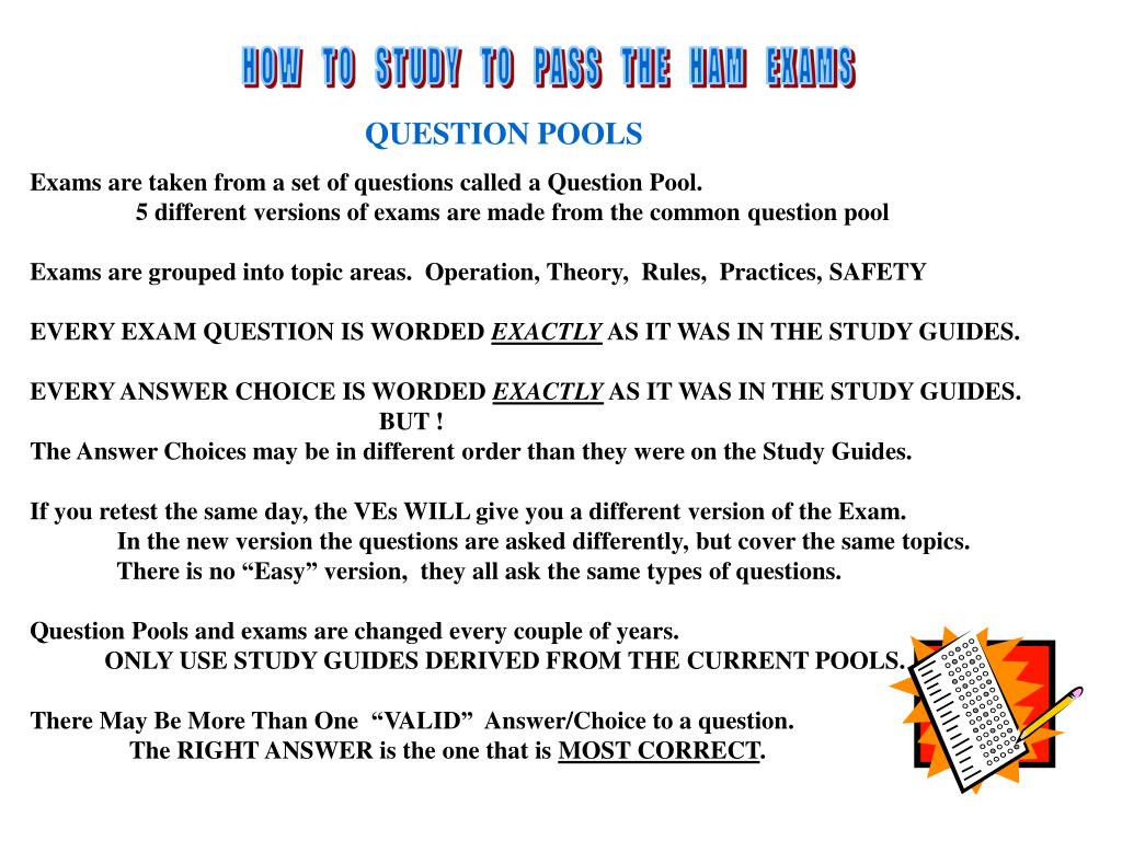 HOW TO STUDY TO PASS THE HAM EXAMS QUESTION POOLS Exams are taken from a set of questions called a Question Pool. 5 different versions of exams are made from the common question pool Exams are grouped into topic areas. Operation, Theory, Rules, Practices, SAFETY EVERY EXAM QUESTION IS WORDED EXACTLY AS IT WAS IN THE STUDY GUIDES. EVERY ANSWER CHOICE IS WORDED EXACTLY AS IT WAS IN THE STUDY GUIDES. BUT ! The Answer Choices may be in different order than they were on the Study Guides. If you retest the same day, the VEs WILL give you a different version of the Exam. In the new version the questions are asked differently, but cover the same topics. There is no “Easy” version, they all ask the same types of questions. Question Pools and exams are changed every couple of years. ONLY USE STUDY GUIDES DERIVED FROM THE CURRENT POOLS. There May Be More Than One “VALID” Answer/Choice to a question. The RIGHT ANSWER is the one that is MOST CORRECT.