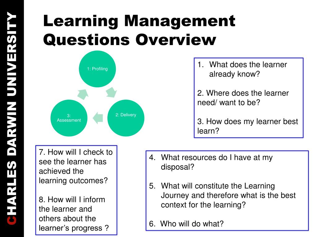 Learning Management Questions Overview What does the learner already know? 2. Where does the learner need/ want to be? 3. How does my learner best learn? 7. How will I check to see the learner has achieved the learning outcomes? 8. How will I inform the learner and others about the learner’s progress ? What resources do I have at my disposal? What will constitute the Learning Journey and therefore what is the best context for the learning? 6. Who will do what?