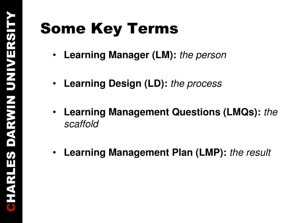 Some Key Terms • Learning Manager (LM): the person • Learning Design (LD): the process • Learning Management Questions (LMQs): the scaffold • Learning Management Plan (LMP): the result
