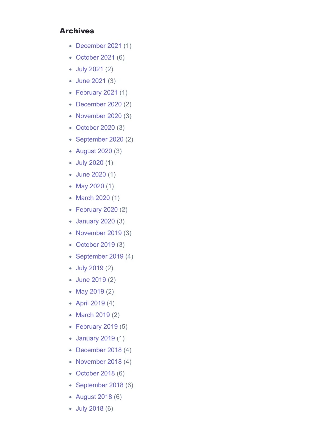 Archives December 2021 (1) October 2021 (6) July 2021 (2) June 2021 (3) February 2021 (1) December 2020 (2) November 2020 (3) October 2020 (3) September 2020 (2) August 2020 (3) July 2020 (1) June 2020 (1) May 2020 (1) March 2020 (1) February 2020 (2) January 2020 (3) November 2019 (3) October 2019 (3) September 2019 (4) July 2019 (2) June 2019 (2) May 2019 (2) April 2019 (4) March 2019 (2) February 2019 (5) January 2019 (1) December 2018 (4) November 2018 (4) October 2018 (6) September 2018 (6) August 2018 (6) July 2018 (6) June 2018 (3)