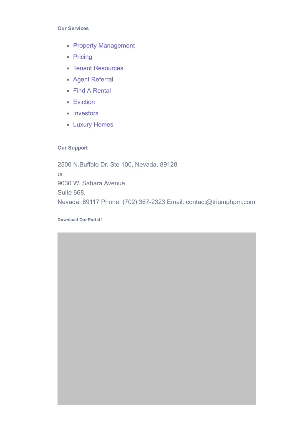 Our Services Property Management Pricing Tenant Resources Agent Referral Find A Rental Eviction Investors Luxury Homes Our Support 2500 N.Buffalo Dr. Ste 100, Nevada, 89128 or 9030 W. Sahara Avenue, Suite 668, Nevada, 89117 Phone: (702) 3672323 Email: contact@triumphpm.com Download Our Portal !
