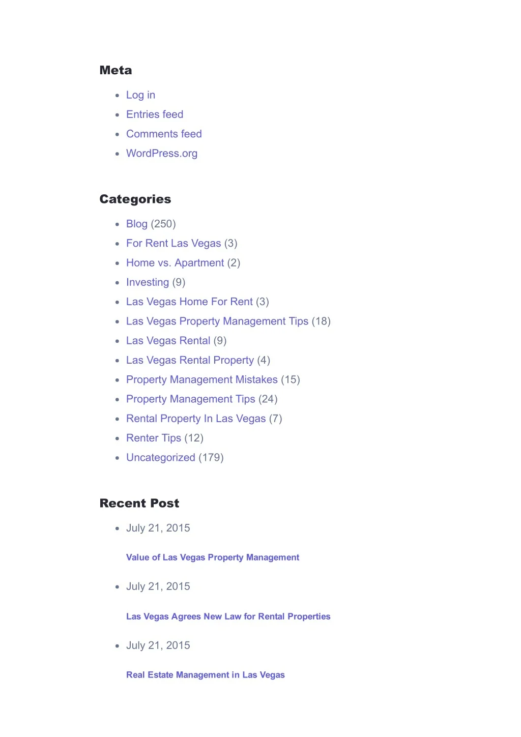 Meta Log in Entries feed Comments feed WordPress.org Categories Blog (250) For Rent Las Vegas (3) Home vs. Apartment (2) Investing (9) Las Vegas Home For Rent (3) Las Vegas Property Management Tips (18) Las Vegas Rental (9) Las Vegas Rental Property (4) Property Management Mistakes (15) Property Management Tips (24) Rental Property In Las Vegas (7) Renter Tips (12) Uncategorized (179) Recent Post July 21, 2015 Value of Las Vegas Property Management July 21, 2015 Las Vegas Agrees New Law for Rental Properties July 21, 2015 Real Estate Management in Las Vegas