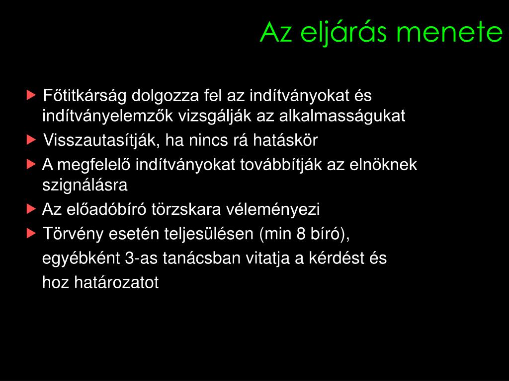 Az eljárás menete Főtitkárság dolgozza fel az indítványokat és indítványelemzők vizsgálják az alkalmasságukat Visszautasítják, ha nincs rá hatáskör A megfelelő indítványokat továbbítják az elnöknek szignálásra Az előadóbíró törzskara véleményezi Törvény esetén teljesülésen (min 8 bíró), egyébként 3-as tanácsban vitatja a kérdést és hoz határozatot