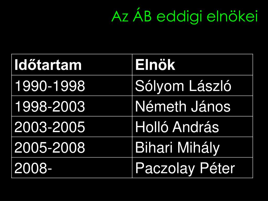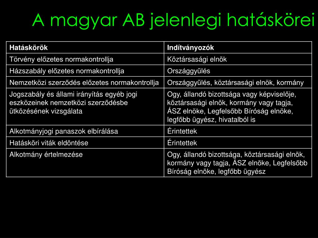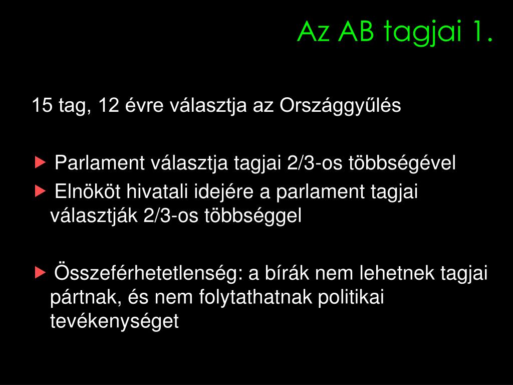 Az AB tagjai 1. 15 tag, 12 évre választja az Országgyűlés Parlament választja tagjai 2/3-os többségével Elnököt hivatali idejére a parlament tagjai választják 2/3-os többséggel Összeférhetetlenség: a bírák nem lehetnek tagjai pártnak, és nem folytathatnak politikai tevékenységet