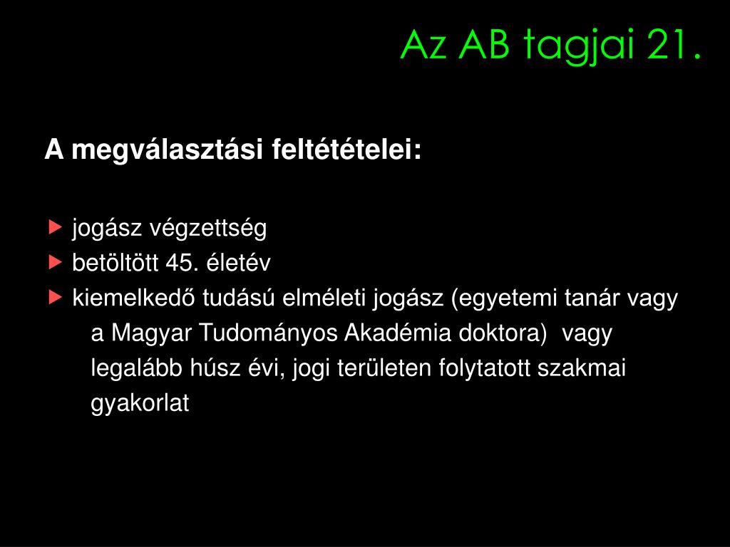 Az AB tagjai 21. A megválasztási feltétételei: jogász végzettség betöltött 45. életév kiemelkedő tudású elméleti jogász (egyetemi tanár vagy a Magyar Tudományos Akadémia doktora) vagy legalább húsz évi, jogi területen folytatott szakmai gyakorlat
