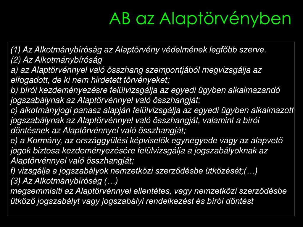 AB az Alaptörvényben (1) Az Alkotmánybíróság az Alaptörvény védelmének legfőbb szerve. (2) Az Alkotmánybíróság a) az Alaptörvénnyel való összhang szempontjából megvizsgálja az elfogadott, de ki nem hirdetett törvényeket; b) bírói kezdeményezésre felülvizsgálja az egyedi ügyben alkalmazandó jogszabálynak az Alaptörvénnyel való összhangját; c) alkotmányjogi panasz alapján felülvizsgálja az egyedi ügyben alkalmazott jogszabálynak az Alaptörvénnyel való összhangját, valamint a bírói döntésnek az Alaptörvénnyel való összhangját; e) a Kormány, az országgyűlési képviselők egynegyede vagy az alapvető jogok biztosa kezdeményezésére felülvizsgálja a jogszabályoknak az Alaptörvénnyel való összhangját; f) vizsgálja a jogszabályok nemzetközi szerződésbe ütközését;(…) (3) Az Alkotmánybíróság (…) megsemmisíti az Alaptörvénnyel ellentétes, vagy nemzetközi szerződésbe ütköző jogszabályt vagy jogszabályi rendelkezést és bírói döntést