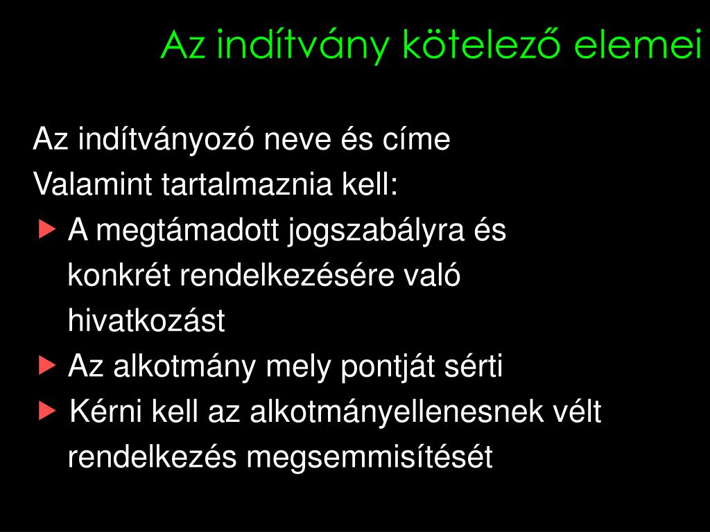 Az indítvány kötelező elemei Az indítványozó neve és címe Valamint tartalmaznia kell: A megtámadott jogszabályra és konkrét rendelkezésére való hivatkozást Az alkotmány mely pontját sérti Kérni kell az alkotmányellenesnek vélt rendelkezés megsemmisítését