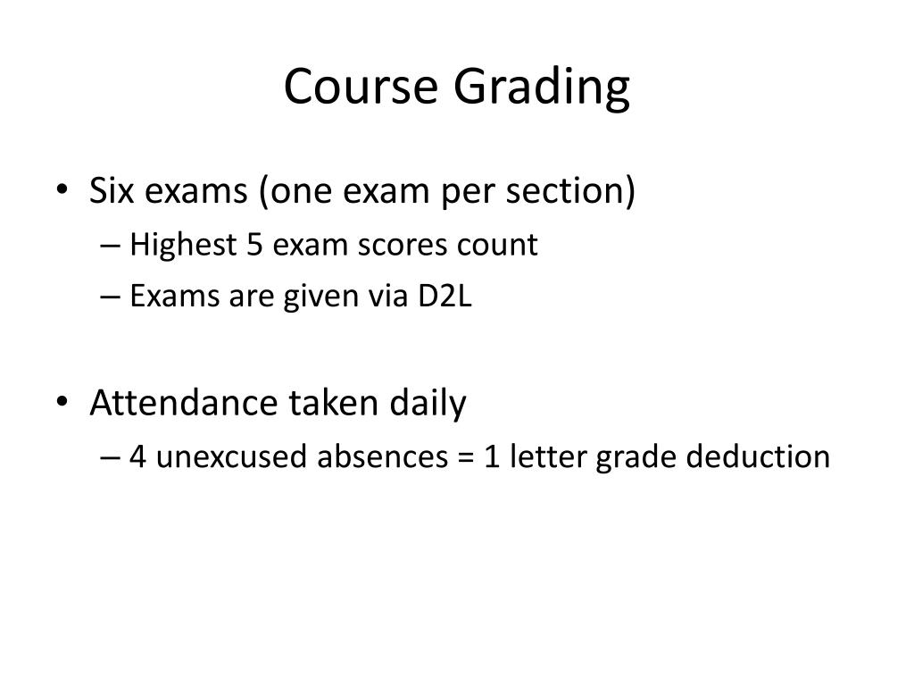 Course Grading • Six exams (one exam per section) • Highest 5 exam scores count • Exams are given via D2L • Attendance taken daily • 4 unexcused absences = 1 letter grade deduction