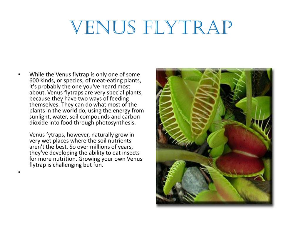 Venus flytrap • While the Venus flytrap is only one of some 600 kinds, or species, of meat-eating plants, it's probably the one you've heard most about. Venus flytraps are very special plants, because they have two ways of feeding themselves. They can do what most of the plants in the world do, using the energy from sunlight, water, soil compounds and carbon dioxide into food through photosynthesis. Venus fytraps, however, naturally grow in very wet places where the soil nutrients aren't the best. So over millions of years, they've developing the ability to eat insects for more nutrition. Growing your own Venus flytrap is challenging but fun.