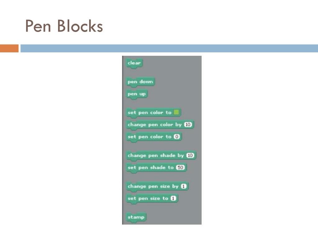 Block Types • Blocks are sorted into categories: • Motion: move a sprite • Looks: change costume/color • Sound: play instrument, song • Pen: draw lines on stage • Control: have sprite make ‘decisions’ • Sensing: See/hear/touch objects • Operators: mathematics and text • Variables: give sprites memory