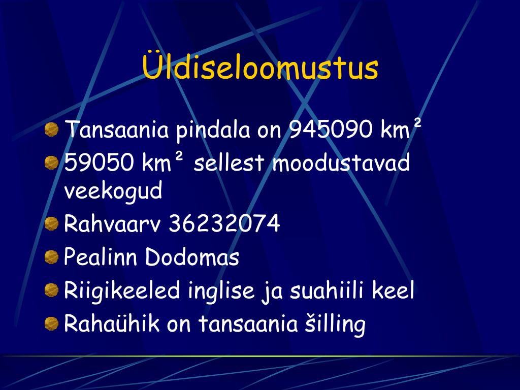 Üldiseloomustus • Tansaania pindala on 945090 km² • 59050 km² sellest moodustavad veekogud • Rahvaarv 36232074 • Pealinn Dodomas • Riigikeeled inglise ja suahiili keel • Rahaühik on tansaania šilling