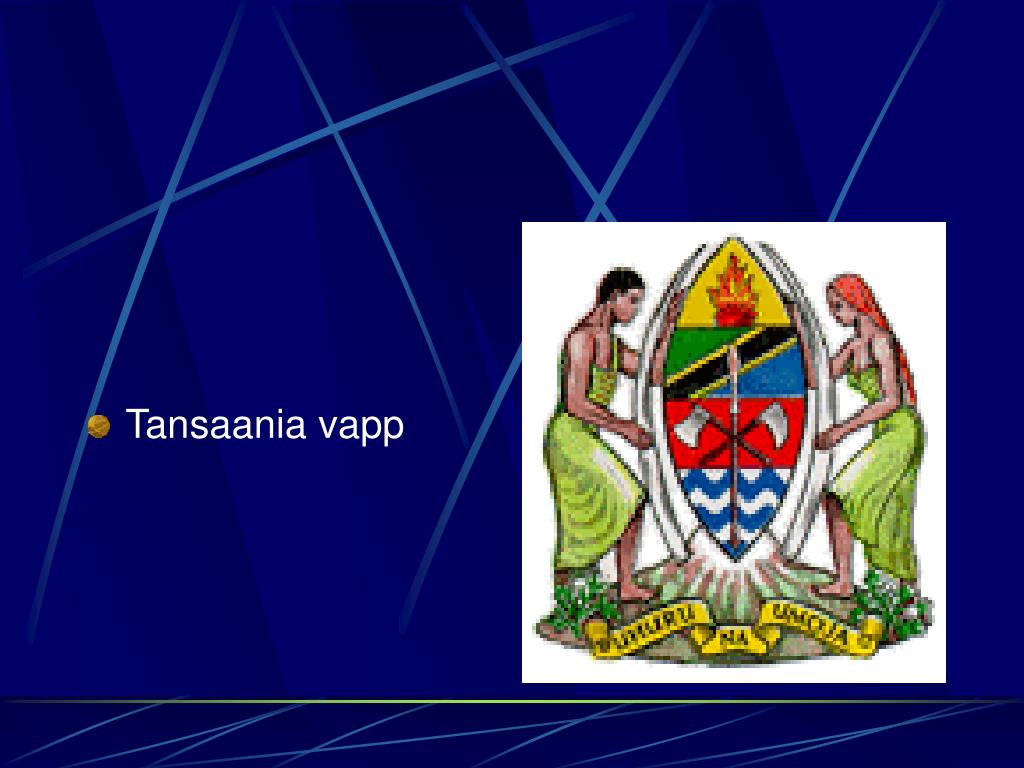 Tansaania. Tiina Tiitum. Üldiseloomustus. Tansaania pindala on 945090 km² 59050 km² sellest moodustavad veekogud Rahvaarv 36232074 Pealinn Dodomas Riigikeeled inglise ja suahiili keel Rahaühik on tansaania šilling. Tansaania kaart. Tansaania lipp. Tansaania vapp. Asukoht.