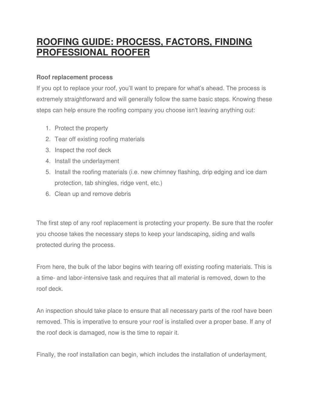 ROOFING GUIDE: PROCESS, FACTORS, FINDING PROFESSIONAL ROOFER Roof replacement process If you opt to replace your roof, you’ll want to prepare for what’s ahead. The process is extremely straightforward and will generally follow the same basic steps. Knowing these steps can help ensure the roofing company you choose isn't leaving anything out: 1. Protect the property 2. Tear off existing roofing materials 3. Inspect the roof deck 4. Install the underlayment 5. Install the roofing materials (i.e. new chimney flashing, drip edging and ice dam protection, tab shingles, ridge vent, etc.) 6. Clean up and remove debris The first step of any roof replacement is protecting your property. Be sure that the roofer you choose takes the necessary steps to keep your landscaping, siding and walls protected during the process. From here, the bulk of the labor begins with tearing off existing roofing materials. This is a time- and labor-intensive task and requires that all material is removed, down to the roof deck. An inspection should take place to ensure that all necessary parts of the roof have been removed. This is imperative to ensure your roof is installed over a proper base. If any of the roof deck is damaged, now is the time to repair it. Finally, the roof installation can begin, which includes the installation of underlayment,