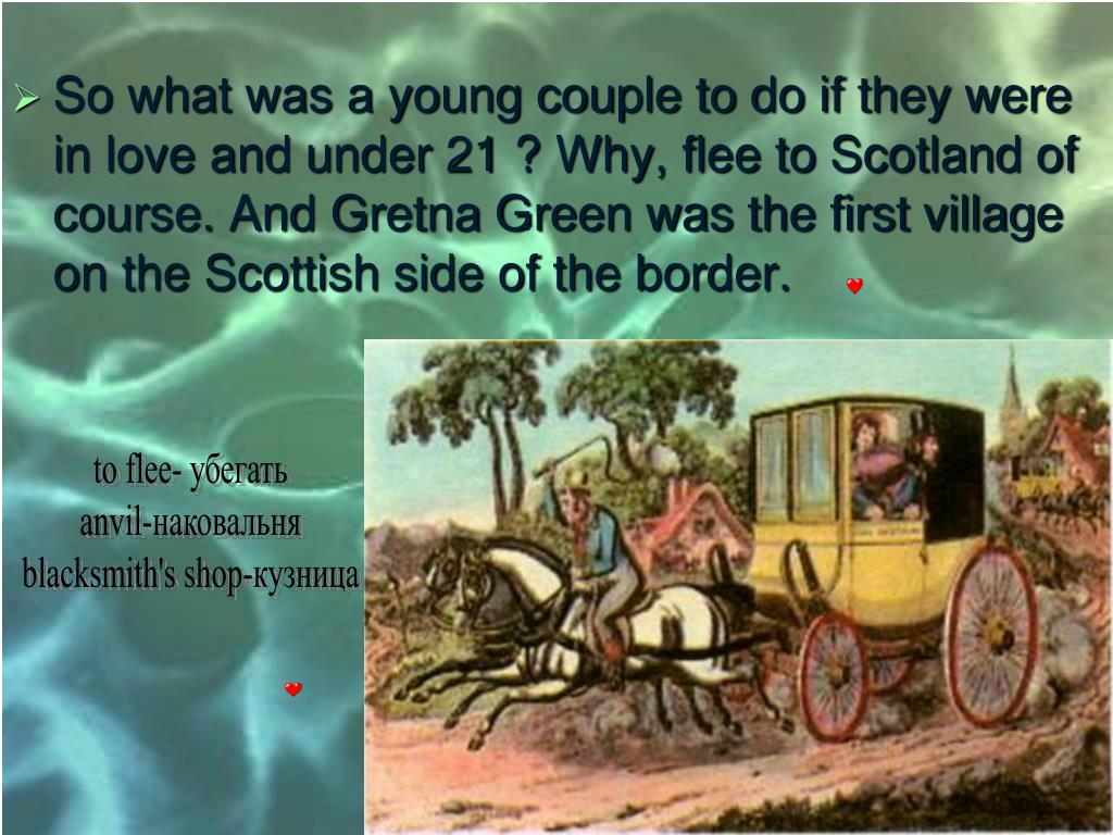 So what was a young couple to do if they were in love and under 21 ? Why, flee to Scotland of course. And Gretna Green was the first village on the Scottish side of the border. to flee- убегать anvil-наковальня blacksmith's shop-кузница