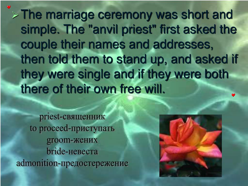 The marriage ceremony was short and simple. The "anvil priest" first asked the couple their names and addresses, then told them to stand up, and asked if they were single and if they were both there of their own free will. priest-священник to proceed-приступать groom-жених bride-невеста admonition-предостережение