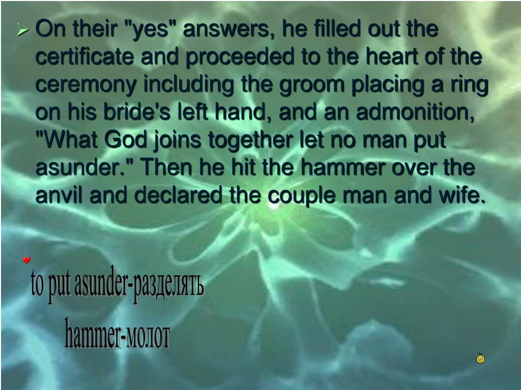 On their "yes" answers, he filled out the certificate and proceeded to the heart of the ceremony including the groom placing a ring on his bride's left hand, and an admonition, "What God joins together let no man put asunder." Then he hit the hammer over the anvil and declared the couple man and wife. to put asunder-разделять hammer-молот