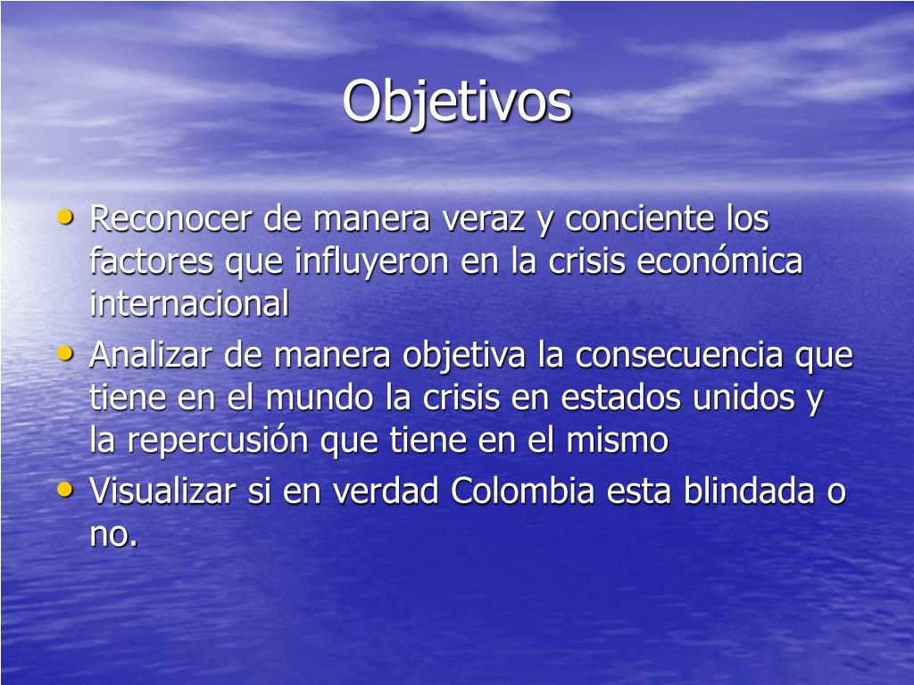 Objetivos • Reconocer de manera veraz y conciente los factores que influyeron en la crisis económica internacional • Analizar de manera objetiva la consecuencia que tiene en el mundo la crisis en estados unidos y la repercusión que tiene en el mismo • Visualizar si en verdad Colombia esta blindada o no.