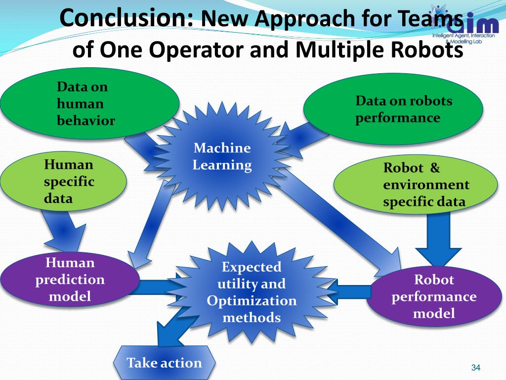Conclusion: New Approach for Teams of One Operator and Multiple Robots • Data on human behavior • Data on robots performance Machine Learning • Human specific data • Robot & environment specific data Expected utility and Optimization methods Human prediction model Robot performance model Take action