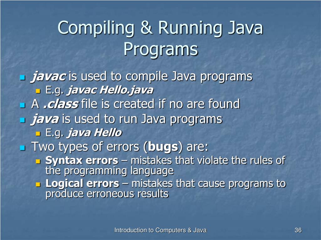 Compiling & Running Java Programs • javac is used to compile Java programs • E.g. javac Hello.java • A .class file is created if no are found • java is used to run Java programs • E.g. java Hello • Two types of errors (bugs) are: • Syntax errors – mistakes that violate the rules of the programming language • Logical errors – mistakes that cause programs to produce erroneous results Introduction to Computers & Java