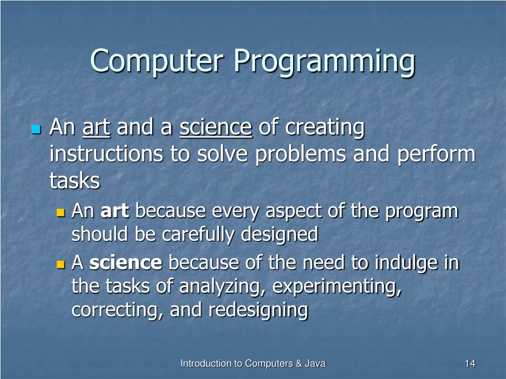 Computer Programming • An art and a science of creating instructions to solve problems and perform tasks • An art because every aspect of the program should be carefully designed • A science because of the need to indulge in the tasks of analyzing, experimenting, correcting, and redesigning Introduction to Computers & Java
