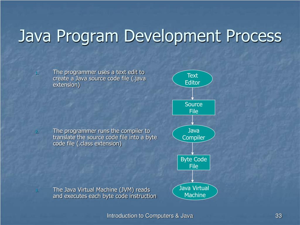 Java Program Development Process • The programmer uses a text edit to create a Java source code file (.java extension) • The programmer runs the compiler to translate the source code file into a byte code file (.class extension) • The Java Virtual Machine (JVM) reads and executes each byte code instruction Text Editor Source File Java Compiler Byte Code File Java Virtual Machine Introduction to Computers & Java