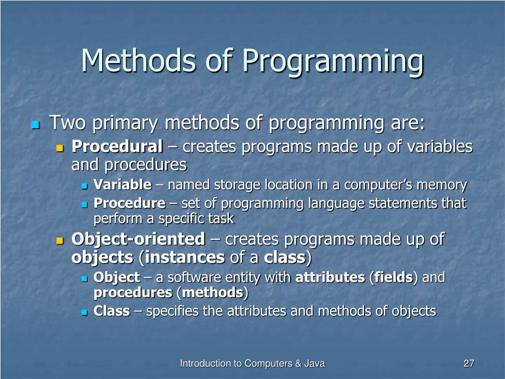 Methods of Programming • Two primary methods of programming are: • Procedural – creates programs made up of variables and procedures • Variable – named storage location in a computer’s memory • Procedure – set of programming language statements that perform a specific task • Object-oriented – creates programs made up of objects (instances of a class) • Object – a software entity with attributes (fields) and procedures (methods) • Class – specifies the attributes and methods of objects Introduction to Computers & Java