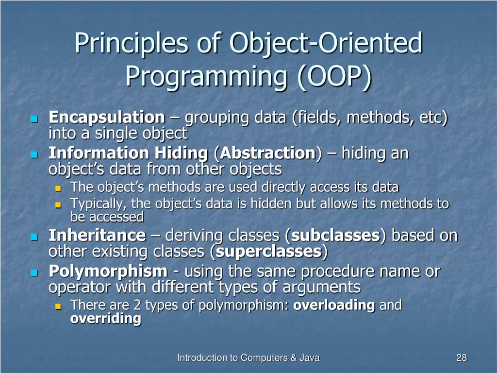 Principles of Object-Oriented Programming (OOP) • Encapsulation – grouping data (fields, methods, etc) into a single object • Information Hiding (Abstraction) – hiding an object’s data from other objects • The object’s methods are used directly access its data • Typically, the object’s data is hidden but allows its methods to be accessed • Inheritance – deriving classes (subclasses) based on other existing classes (superclasses) • Polymorphism - using the same procedure name or operator with different types of arguments • There are 2 types of polymorphism: overloading and overriding Introduction to Computers & Java