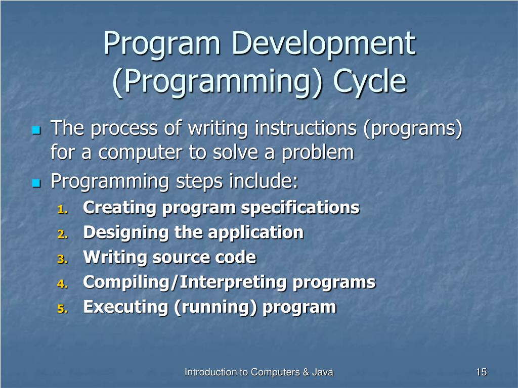 Program Development (Programming) Cycle… • Creating program specifications – the requirements the application must meet Introduction to Computers & Java