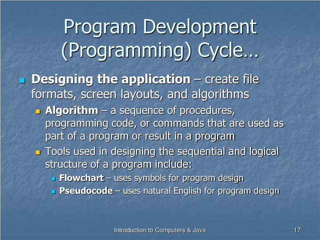 Program Development (Programming) Cycle… • Designing the application – create file formats, screen layouts, and algorithms • Algorithm – a sequence of procedures, programming code, or commands that are used as part of a program or result in a program • Tools used in designing the sequential and logical structure of a program include: • Flowchart – uses symbols for program design • Pseudocode – uses natural English for program design Introduction to Computers & Java