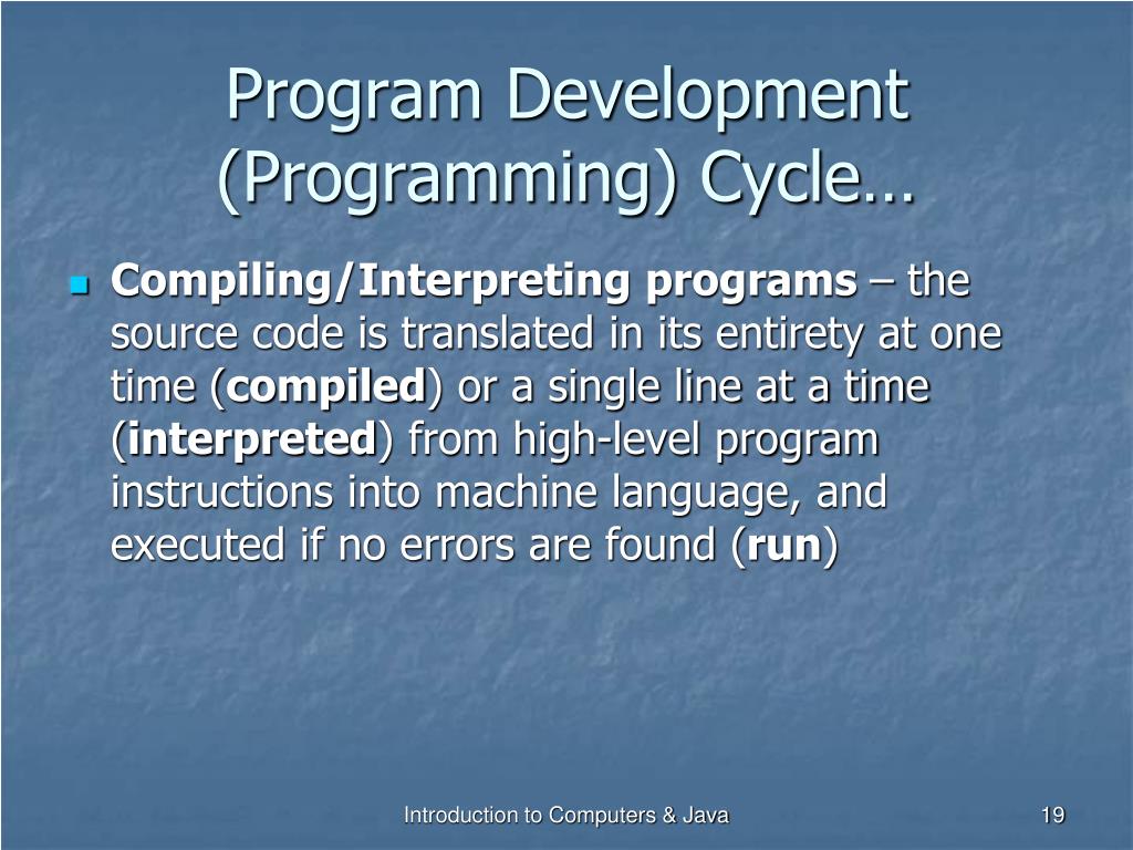 Program Development (Programming) Cycle… • Compiling/Interpreting programs – the source code is translated in its entirety at one time (compiled) or a single line at a time (interpreted) from high-level program instructions into machine language, and executed if no errors are found (run) Introduction to Computers & Java