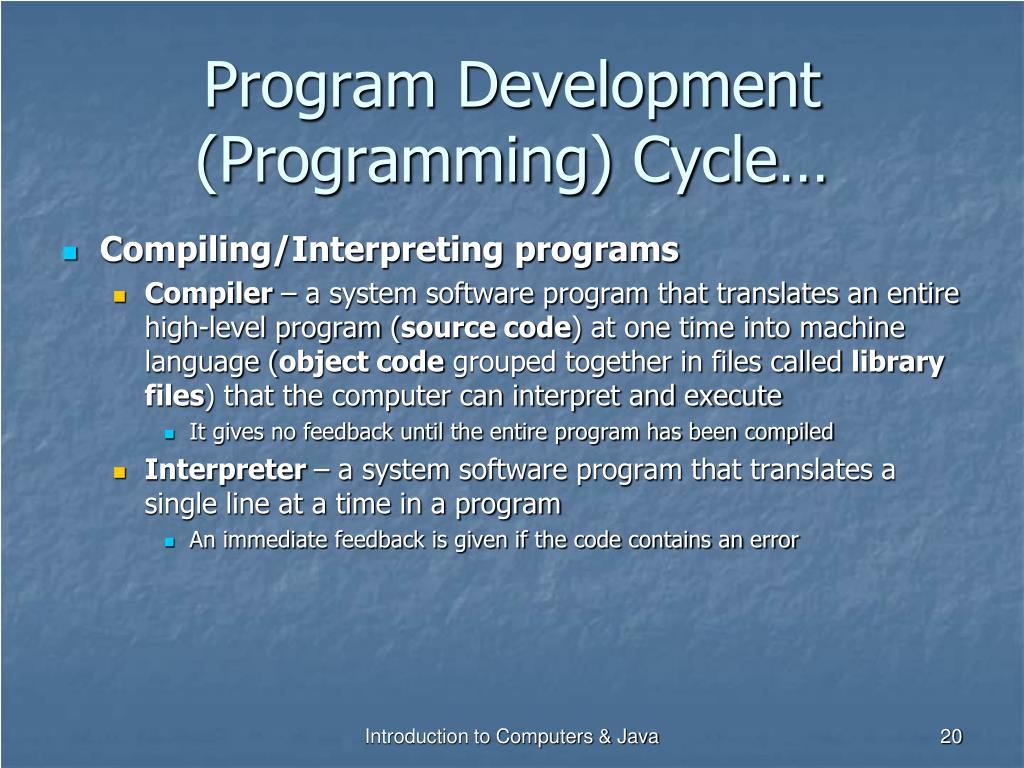 Program Development (Programming) Cycle… • Compiling/Interpreting programs • Compiler – a system software program that translates an entire high-level program (source code) at one time into machine language (object code grouped together in files called library files) that the computer can interpret and execute • It gives no feedback until the entire program has been compiled • Interpreter – a system software program that translates a single line at a time in a program • An immediate feedback is given if the code contains an error Introduction to Computers & Java