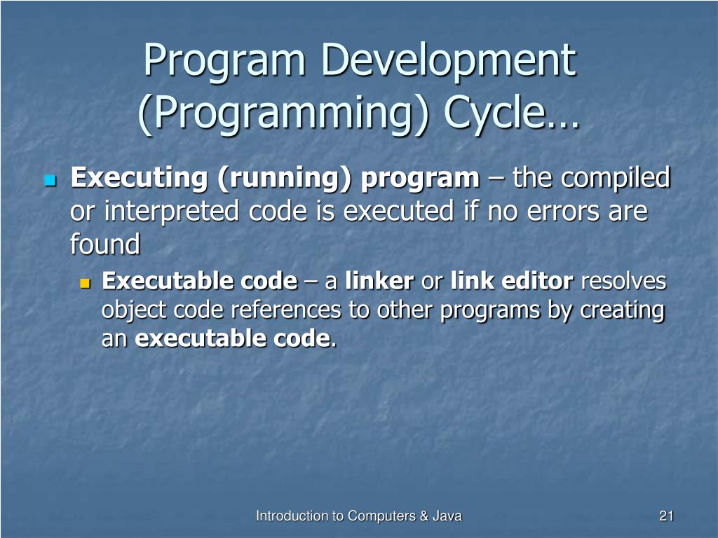 Program Development (Programming) Cycle… • Executing (running) program – the compiled or interpreted code is executed if no errors are found • Executable code – a linker or link editor resolves object code references to other programs by creating an executable code. Introduction to Computers & Java