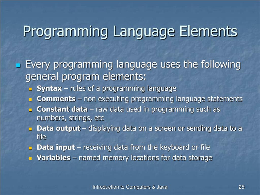 Programming Language Elements • Every programming language uses the following general program elements: • Syntax – rules of a programming language • Comments – non executing programming language statements • Constant data – raw data used in programming such as numbers, strings, etc • Data output – displaying data on a screen or sending data to a file • Data input – receiving data from the keyboard or file • Variables – named memory locations for data storage Introduction to Computers & Java