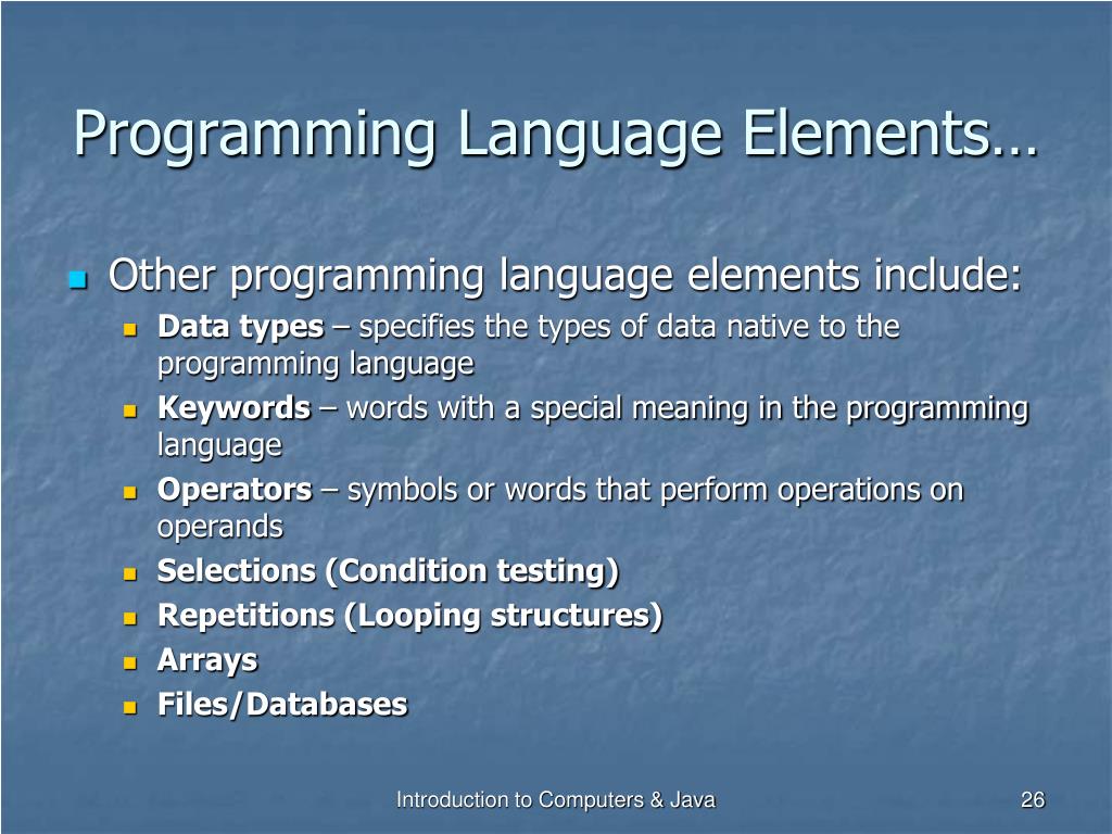 Programming Language Elements… • Other programming language elements include: • Data types – specifies the types of data native to the programming language • Keywords – words with a special meaning in the programming language • Operators – symbols or words that perform operations on operands • Selections (Condition testing) • Repetitions (Looping structures) • Arrays • Files/Databases Introduction to Computers & Java
