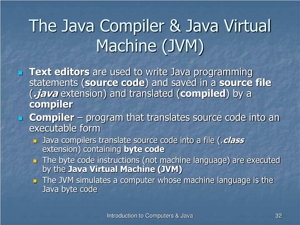 The Java Compiler & Java Virtual Machine (JVM) • Text editors are used to write Java programming statements (source code) and saved in a source file (.java extension) and translated (compiled) by a compiler • Compiler – program that translates source code into an executable form • Java compilers translate source code into a file (.class extension) containing byte code • The byte code instructions (not machine language) are executed by the Java Virtual Machine (JVM) • The JVM simulates a computer whose machine language is the Java byte code Introduction to Computers & Java