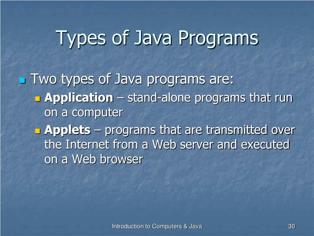Types of Java Programs • Two types of Java programs are: • Application – stand-alone programs that run on a computer • Applets – programs that are transmitted over the Internet from a Web server and executed on a Web browser Introduction to Computers & Java