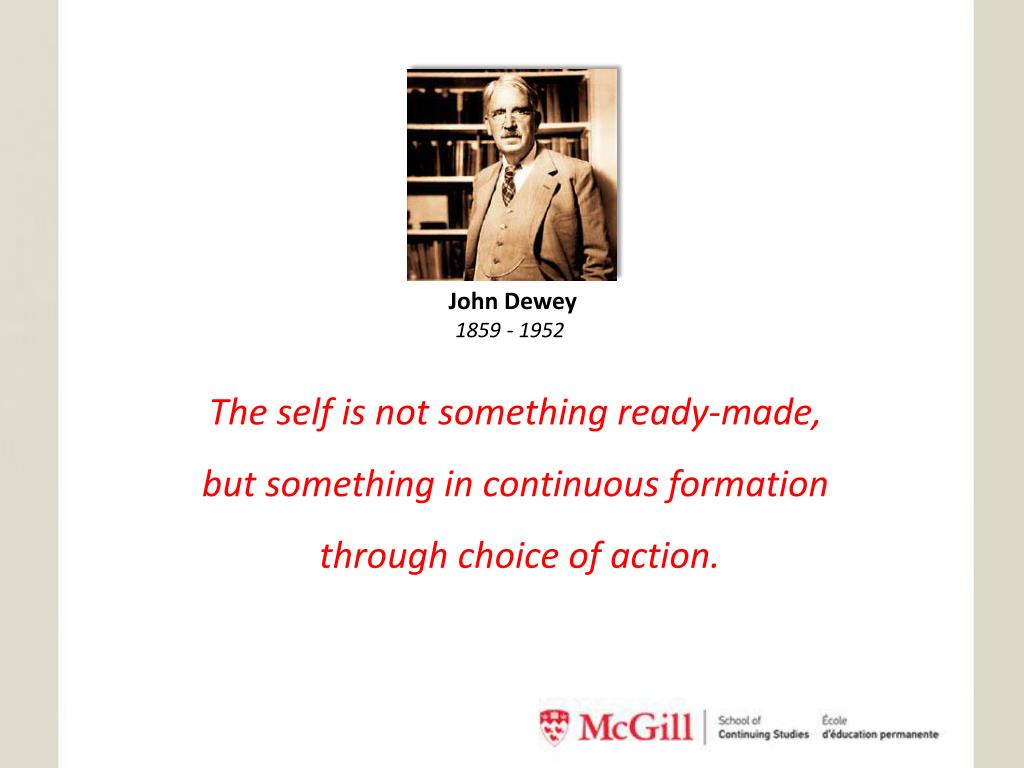 John Dewey 1859 - 1952 The self is not something ready-made, but something in continuous formation through choice of action.