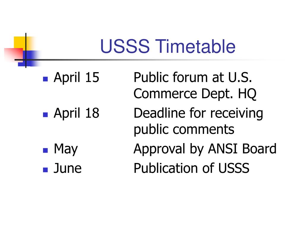 USSS Timetable • April 15 Public forum at U.S. Commerce Dept. HQ • April 18 Deadline for receiving public comments • May Approval by ANSI Board • June Publication of USSS