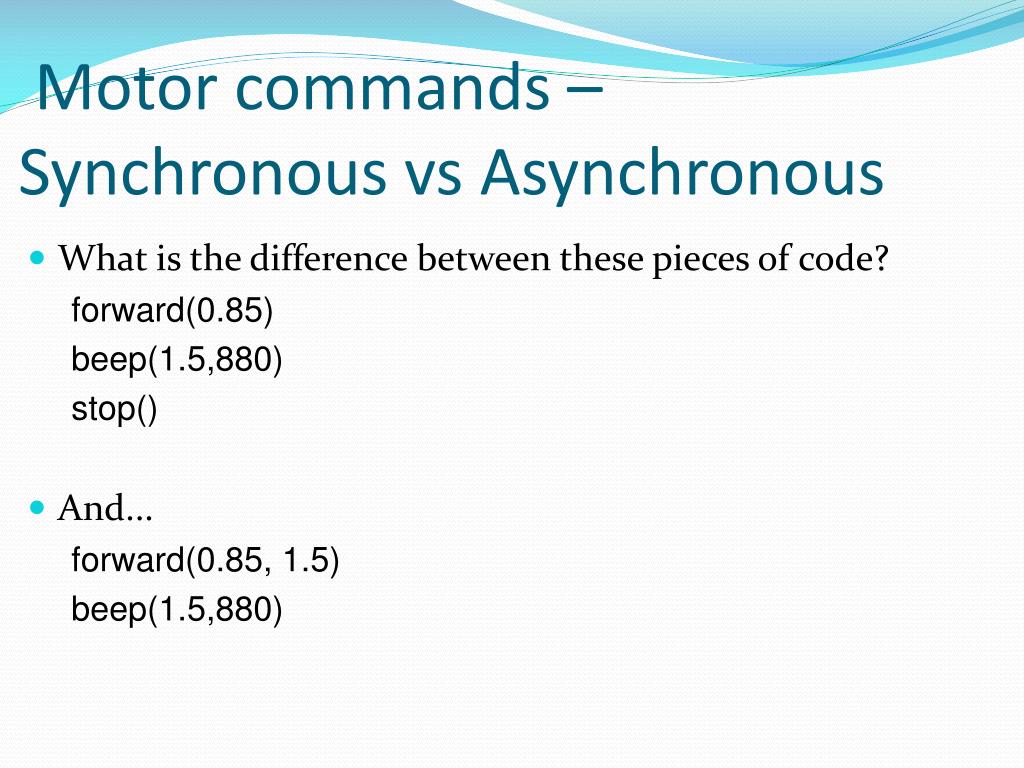 Motor commands – Synchronous vs Asynchronous • What is the difference between these pieces of code? forward(0.85) beep(1.5,880) stop() • And... forward(0.85, 1.5) beep(1.5,880)