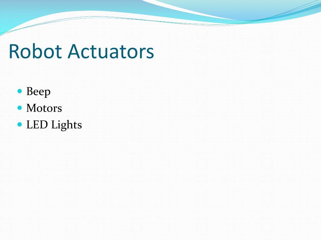Robot Actuators – Motors – Utility Functions • The previous functions would all start the robot, go for a certain amount of time, and then stop the robot automatically. • You an also start the robot moving without specifying how long it should do so: • forward(speed), turnLeft(speed), backward(speed), turnRight(speed), stop() • Very important to call the stop() function when you want the robot to stop! • The wait(seconds) function can be used to specify how long the robot should travel: forward(0.85) wait(1.5) stop()
