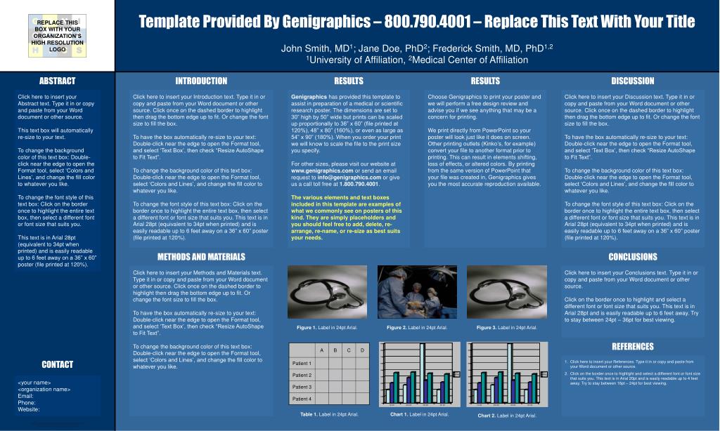 Template Provided By Genigraphics – 800.790.4001 – Replace This Text With Your Title REPLACE THIS BOX WITH YOUR ORGANIZATION’S HIGH RESOLUTION LOGO John Smith, MD1; Jane Doe, PhD2; Frederick Smith, MD, PhD1,2 1University of Affiliation, 2Medical Center of Affiliation ABSTRACT INTRODUCTION RESULTS RESULTS DISCUSSION Click here to insert your Abstract text. Type it in or copy and paste from your Word document or other source. This text box will automatically re-size to your text. To change the background color of this text box: Double-click near the edge to open the Format tool, select ‘Colors and Lines’, and change the fill color to whatever you like. To change the font style of this text box: Click on the border once to highlight the entire text box, then select a different font or font size that suits you. This text is in Arial 28pt (equivalent to 34pt when printed) and is easily readable up to 6 feet away on a 36” x 60” poster (file printed at 120%). Click here to insert your Introduction text. Type it in or copy and paste from your Word document or other source. Click once on the dashed border to highlight then drag the bottom edge up to fit. Or change the font size to fill the box. To have the box automatically re-size to your text: Double-click near the edge to open the Format tool, and select ‘Text Box’, then check “Resize AutoShape to Fit Text”. To change the background color of this text box: Double-click near the edge to open the Format tool, select ‘Colors and Lines’, and change the fill color to whatever you like. To change the font style of this text box: Click on the border once to highlight the entire text box, then select a different font or font size that suits you. This text is in Arial 28pt (equivalent to 34pt when printed) and is easily readable up to 6 feet away on a 36” x 60” poster (file printed at 120%). Choose Genigraphics to print your poster and we will perform a free design review and advise you if we see anything that may be a concern for printing. We print directly from PowerPoint so your poster will look just like it does on screen. Other printing outlets (Kinko’s, for example) convert your file to another format prior to printing. This can result in elements shifting, loss of effects, or altered colors. By printing from the same version of PowerPoint that your file was created in, Genigraphics gives you the most accurate reproduction available. Click here to insert your Discussion text. Type it in or copy and paste from your Word document or other source. Click once on the dashed border to highlight then drag the bottom edge up to fit. Or change the font size to fill the box. To have the box automatically re-size to your text: Double-click near the edge to open the Format tool, and select ‘Text Box’, then check “Resize AutoShape to Fit Text”. To change the background color of this text box: Double-click near the edge to open the Format tool, select ‘Colors and Lines’, and change the fill color to whatever you like. To change the font style of this text box: Click on the border once to highlight the entire text box, then select a different font or font size that suits you. This text is in Arial 28pt (equivalent to 34pt when printed) and is easily readable up to 6 feet away on a 36” x 60” poster (file printed at 120%). Genigraphics has provided this template to assist in preparation of a medical or scientific research poster. The dimensions are set to 30” high by 50” wide but prints can be scaled up proportionally to 36” x 60” (file printed at 120%), 48” x 80” (160%), or even as large as 54” x 90” (180%). When you order your print we will know to scale the file to the print size you specify. For other sizes, please visit our website at www.genigraphics.com or send an email request to info@genigraphics.com or give us a call toll free at 1.800.790.4001. The various elements and text boxes included in this template are examples of what we commonly see on posters of this kind. They are simply placeholders and you should feel free to add, delete, re-arrange, re-name, or re-size as best suits your needs. METHODS AND MATERIALS CONCLUSIONS Click here to insert your Methods and Materials text. Type it in or copy and paste from your Word document or other source. Click once on the dashed border to highlight then drag the bottom edge up to fit. Or change the font size to fill the box. To have the box automatically re-size to your text: Double-click near the edge to open the Format tool, and select ‘Text Box’, then check “Resize AutoShape to Fit Text”. To change the background color of this text box: Double-click near the edge to open the Format tool, select ‘Colors and Lines’, and change the fill color to whatever you like. Click here to insert your Conclusions text. Type it in or copy and paste from your Word document or other source. Click on the border once to highlight and select a different font or font size that suits you. This text is in Arial 28pt and is easily readable up to 6 feet away. Try to stay between 24pt – 36pt for best viewing. Figure 1. Label in 24pt Arial. Figure 2. Label in 24pt Arial. Figure 3. Label in 24pt Arial. REFERENCES CONTACT • Click here to insert your References. Type it in or copy and paste from your Word document or other source. • Click on the border once to highlight and select a different font or font size that suits you. This text is in Arial 20pt and is easily readable up to 4 feet away. Try to stay between 16pt – 24pt for best viewing. <your name> <organization name> Email: Phone: Website: Table 1. Label in 24pt Arial. Chart 1. Label in 24pt Arial. Chart 2. Label in 24pt Arial.