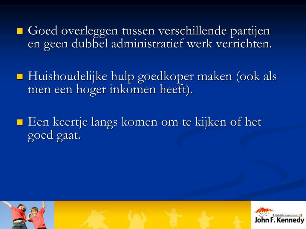 Goed overleggen tussen verschillende partijen en geen dubbel administratief werk verrichten. Huishoudelijke hulp goedkoper maken (ook als men een hoger inkomen heeft). Een keertje langs komen om te kijken of het goed gaat.
