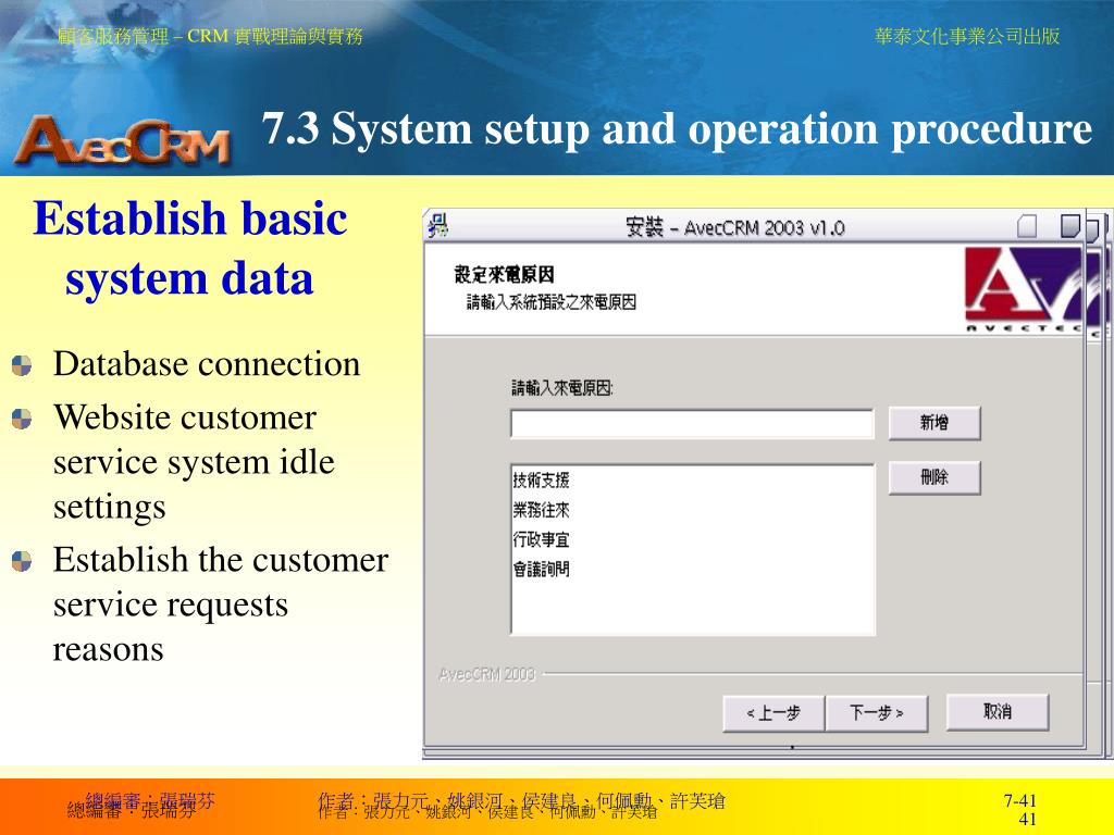 7.3 System setup and operation procedure CRM system setup processes • Define groups and users • Definevoice process • Define hotkeys • Establish web system and install predefined data 作者:張力元、姚銀河、侯建良、何佩勳、許芙瑲
