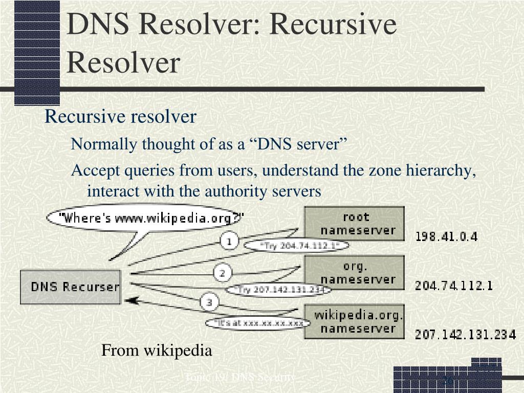 Topic 19: DNS Security DNS Resolver: Recursive Resolver • Recursive resolver • Normally thought of as a “DNS server” • Accept queries from users, understand the zone hierarchy, interact with the authority servers • Cache answers From wikipedia