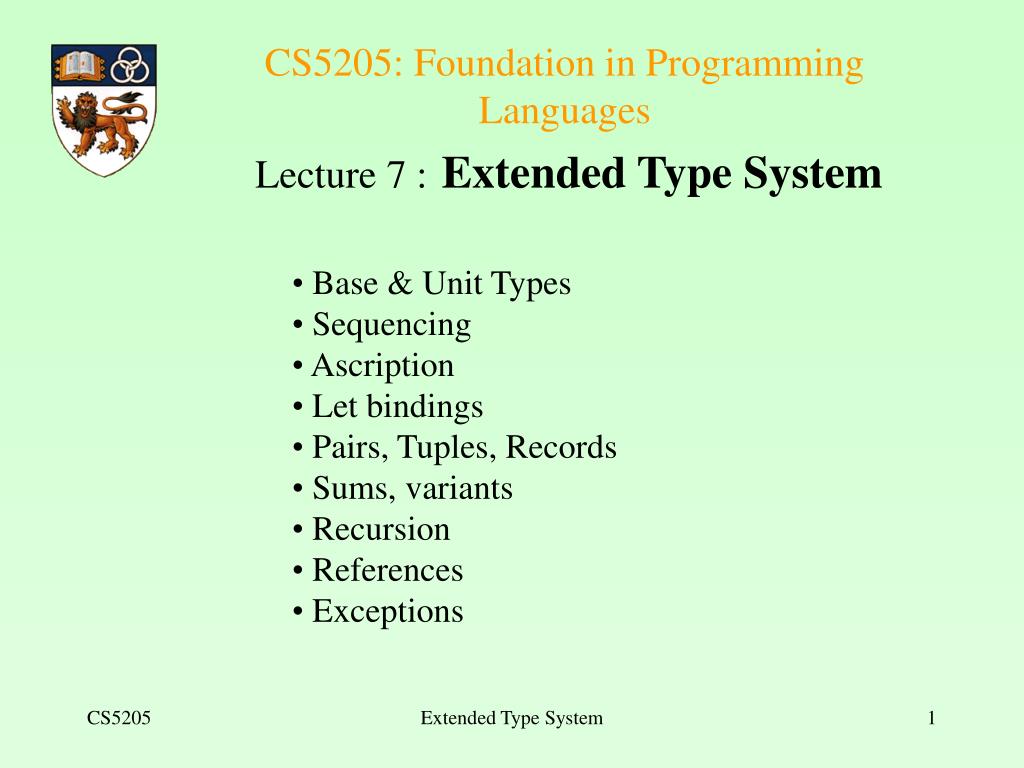CS5205: Foundation in Programming LanguagesLecture 7 :Extended Type System • Base & Unit Types • Sequencing • Ascription • Let bindings • Pairs, Tuples, Records • Sums, variants • Recursion • References • Exceptions Extended Type System