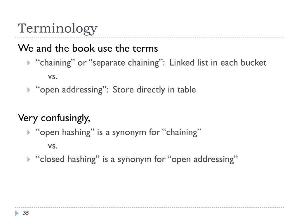 Terminology We and the book use the terms • “chaining” or “separate chaining”: Linked list in each bucket vs. • “open addressing”: Store directly in table Very confusingly, • “open hashing” is a synonym for “chaining” vs. • “closed hashing” is a synonym for “open addressing”