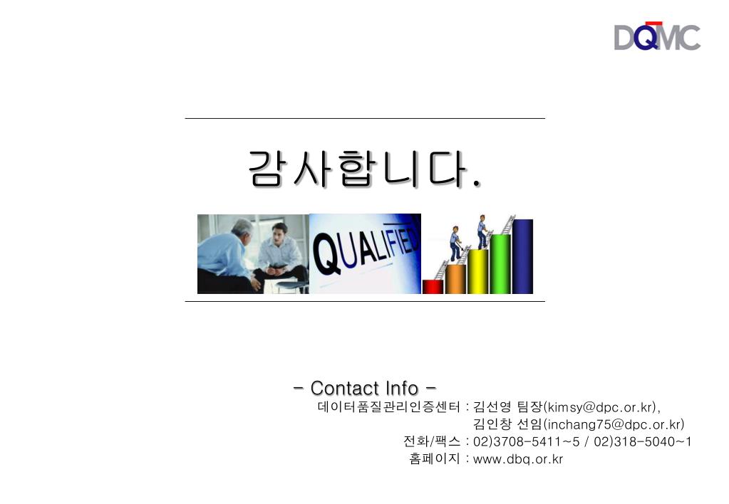 감사합니다. - Contact Info - 데이터품질관리인증센터 :전화/팩스 :홈페이지 : 김선영 팀장(kimsy@dpc.or.kr),김인창 선임(inchang75@dpc.or.kr)02)3708-5411~5 / 02)318-5040~1www.dbq.or.kr